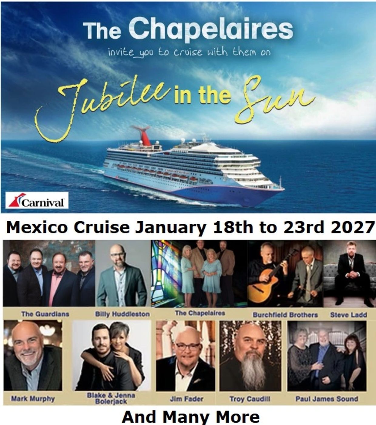 The official brochure for this cruise will be available in the near future and it will list all of the groups and the speakers that are part of the January 2027 Gospel Jubilee in the Sun cruise. In the meantime we have attached a pre-cruise poster which outlines all the details required to book this cruise .